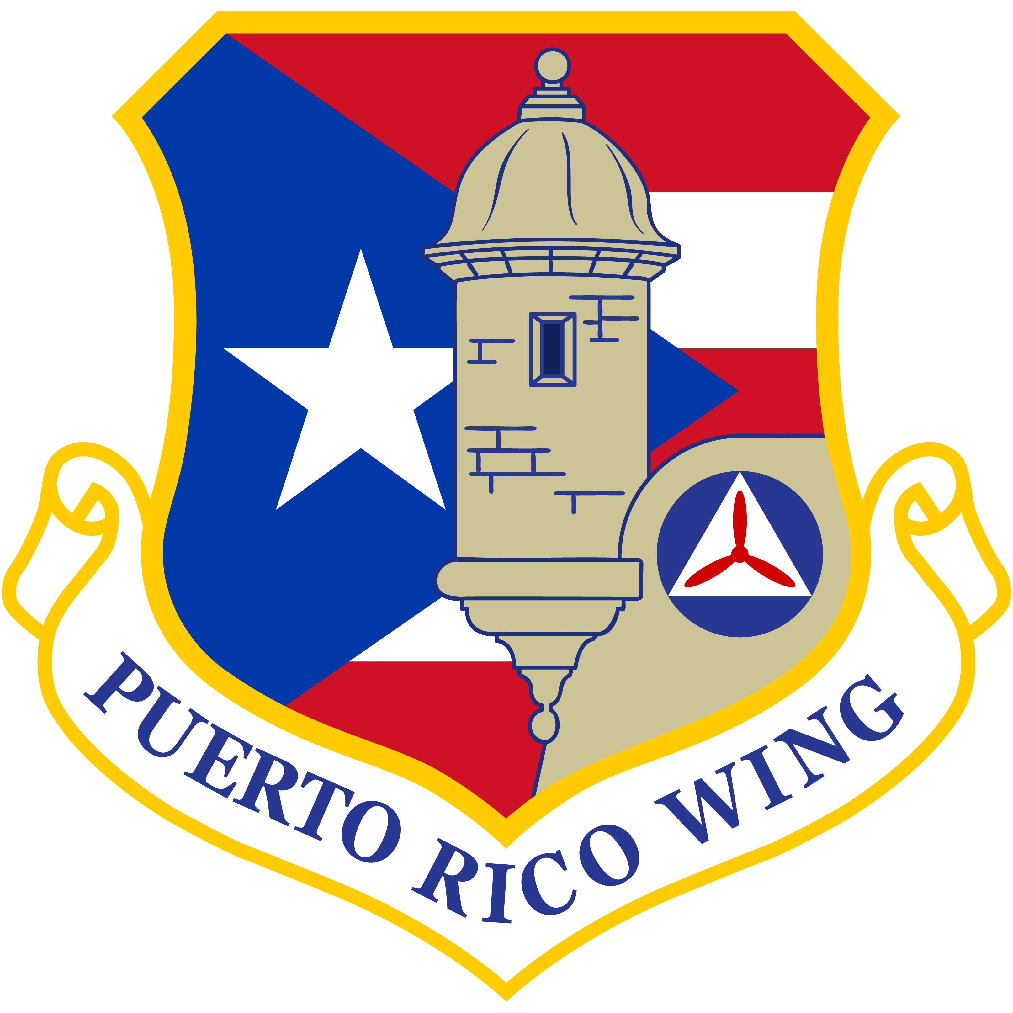 The emblem is rendered in the traditional Air Force-style shield, bordered in gold. It features the Puerto Rican flag as the background, a Spanish colonial watchtower (Garita in Spanish) at the center, and the historic Civil Air Patrol roundel to the right. A scroll bearing the inscription "Puerto Rico Wing" anchors the emblem at the base. Each element was chosen with deliberate intent to represent the Wing’s identity, mission, and historical continuity.