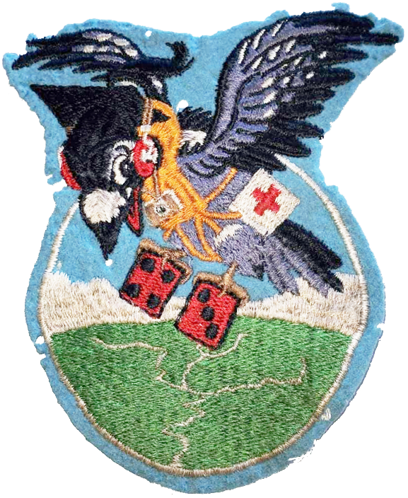 The mission of Group VII is symbolized by the life jacket and the first-aid kit representing rescue; the camera denotes reconnaissance; the ear phones suggest communications and the mortar board brings to mind the group’s mission to instruct the youth of its area in aviation careers so necessary to the well-being of the country. The dice showing the total number seven are not merely the unit’s designation, but signify the good luck wished them by the community from which the members of the group are drawn. Not only because the Downy Woodpecker is native to Group VII’s geographical location, but because he is a small bird, symbolic of the light aircraft operated by the members, he is shown here in an attitude of cheerful service to the community over which he flies. The Downy Woodpecker is a great friend both to farmers and city dwellers, but an enemy of all insect life which destroys crops and mars the tree-shaded beauty of urban areas. So it is with the mission of Group VII. The joining of the rivers indicated on the terrain further symbolizes the concerning unity of individual squadrons of the section which merged to form Group VII of the Ohio Wing. The green earth is indicative of the native soil the members of this organization are determined to protect and preserve.